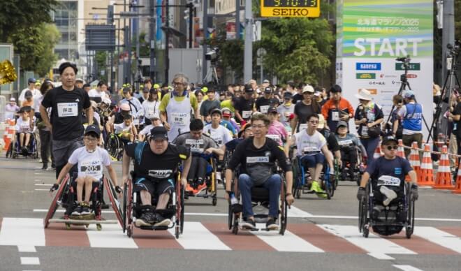 2015大会から「はまなす車いすマラソン」と合同開催、2018大会に「視覚障がい者の部」を設けました。2024大会では「オープンの部」を新設し、順位を競うことを望まない方や性別、年齢による比較枠を望まない方を受け入れる取り組みを継続します。